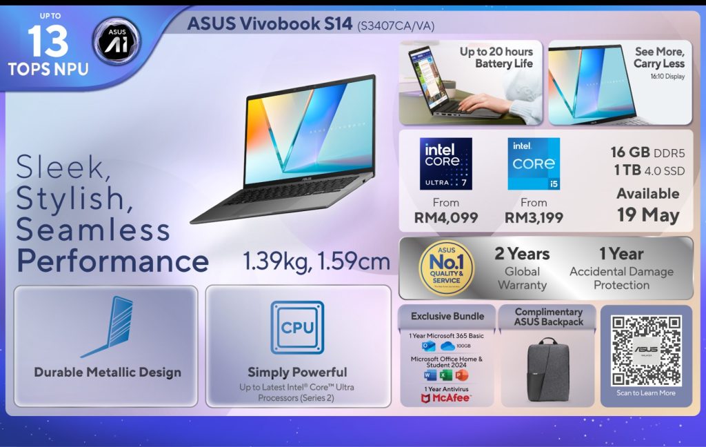 - ASUS Malaysia announces the new Vivobook S14/S16 series, AI-ready laptops with sleek metallic designs.