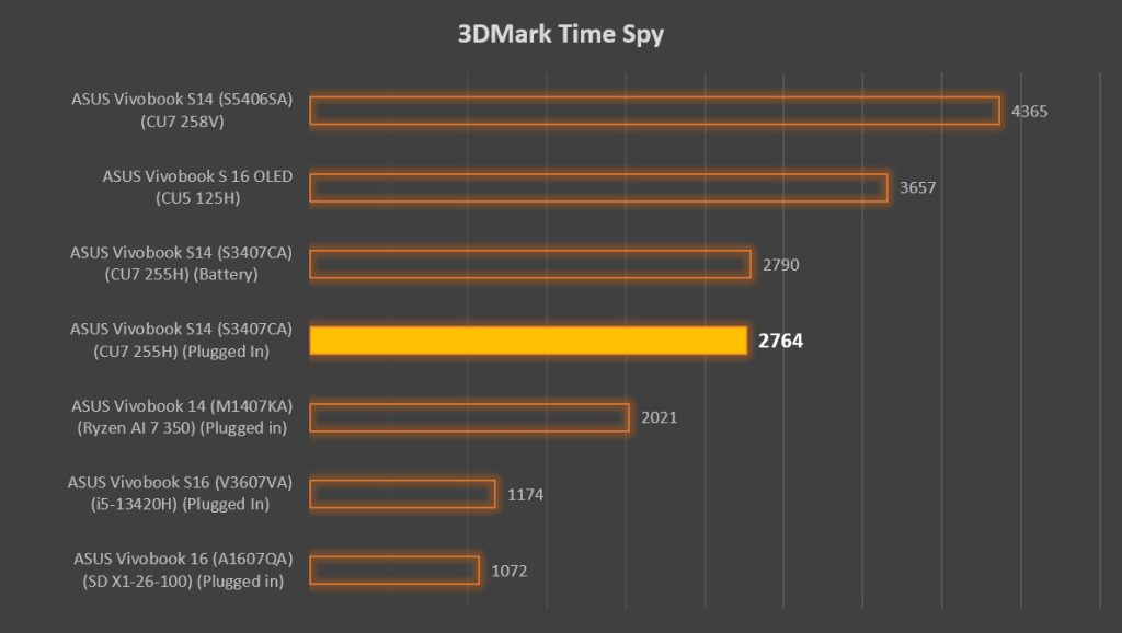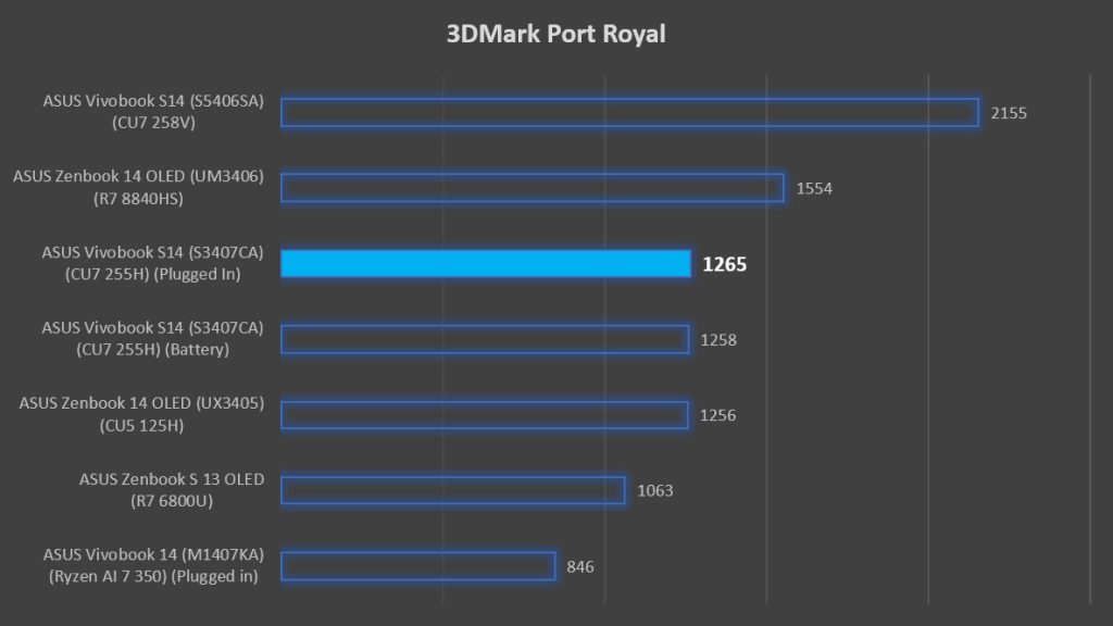 Before we get ahead of ourselves, the graphics capabilities of the ASUS Vivobook S14 (S3407CA) is somewhat limited, and would need another stick of RAM to deliver its full performance. In any case, the showing is pretty promising, and based on what we found online, this Intel Arc 140T in the Core Ultra 7 255H is one of the fastest integrated graphics out there, outperforming even the AMD Ryzen AI 9 HX 370 and Core Ultra 7 258V‘s respective integrated GPUs.