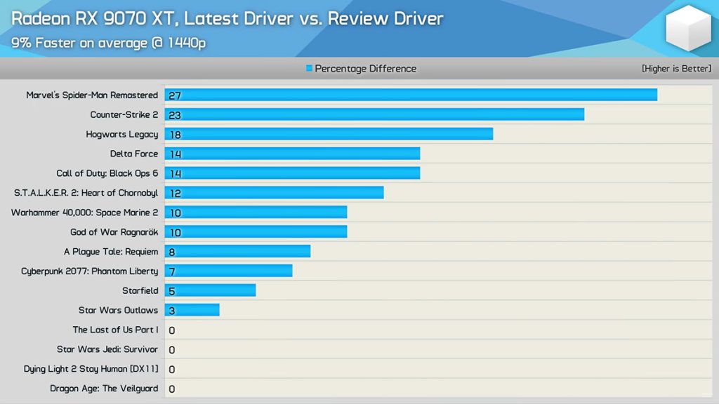 As usual with AMD, Fine Wine happened. The new AMD Radeon RX 9070 XT is enjoying a humongous performance bump with the latest Adrenalin Driver 25.6.3, boosting performance by up to 27% in Marvel’s Spider-Man Remastered. While this huge a gain is only seen in a single title, the overall improvement is still quite significant, with the current AMD flagship graphics card gaining 9% on average at 1440p, and 4% on average at 4K.