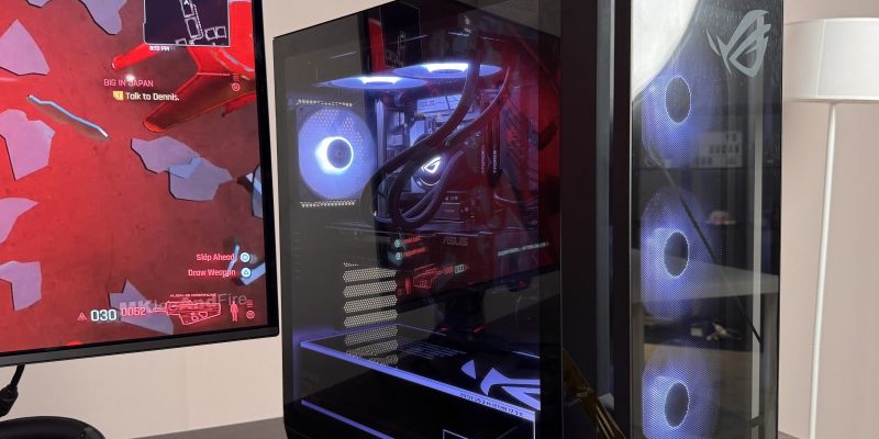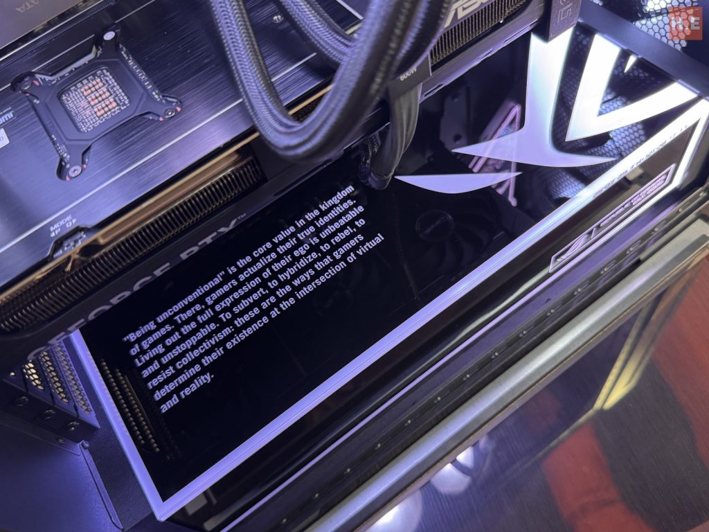 ROG has also incorporated some interesting design elements, like a cool acrylic light plate beside a shroud that neatly hides the 24-pin cable. While the overall cable management is decent, a minor flaw is the liquid cooler’s wiring running over the motherboard’s VRM cooler. However, with tool-less panels, fixing this and upgrading the G700 is a breeze. One peculiar design choice is a light-up plate on the PSU shroud with a somewhat “cringy” paragraph about the “kingdom of games.” It would’ve been preferable to see ROG Cybertext there instead.