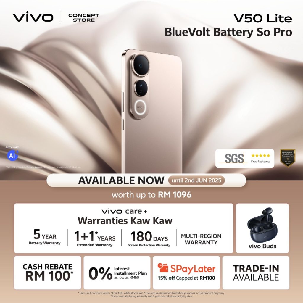 From now until June 2, 2025, customers who purchase the vivo V50 Lite 5G at a vivo Concept Store will receive a bundle of exclusive rewards, including vivo Buds worth RM129, a RM100 cash rebate, 1+1 years vivo care+ extended warranty, a 5-year vivo care+ battery warranty, a 180-day screen protection warranty, and multi-region warranty coverage.